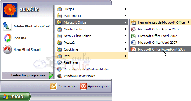 situado, normalmente, en la esquina inferior izquierda de la pantalla. Coloca el cursor y haz clic sobre el botón Inicio se despliega un menú; al colocar el cursor sobre Programas, aparece otra lista con los programas que hay instalados en tu ordenador; buscar Microsoft PowerPoint, y al hacer clic sobre él e arrancará el programa.